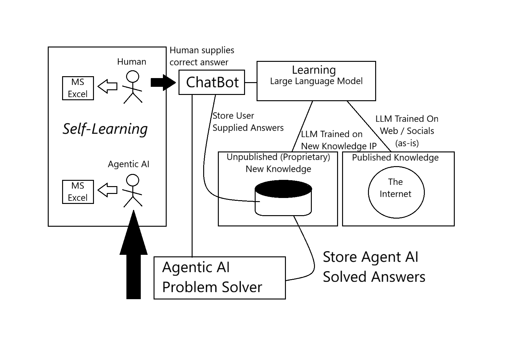 A Vision for Self-Learning LLMs Imagine, instead, an LLM that could proactively initiate its own AI Agent—one that spins up an instance of Excel, tests various solutions through trial and error, and iteratively refines its approach until the correct result is achieved. This agent would not merely reference its knowledge base but would actively generate unpublished, proprietary knowledge through self-guided experimentation. In essence, it would “learn by doing,” much as a human would when faced with a new problem.